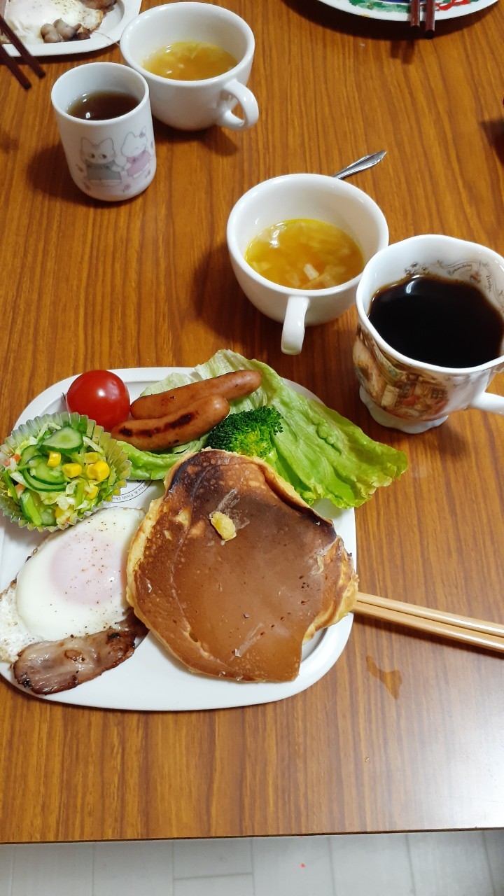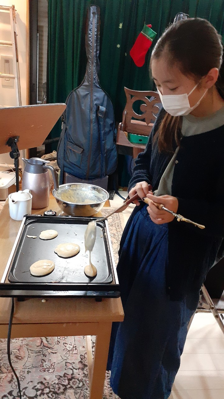 朝食のパンケーキも自ら焼きます。