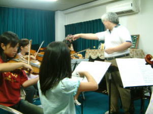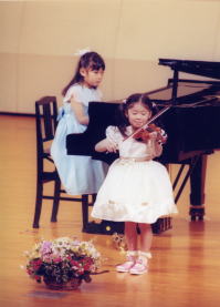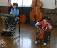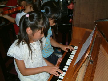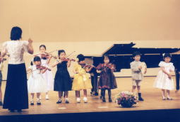 また、日曜日にどうしても通えないお子様は、発表会前の何回かの合わせでアンサンブル出演をすることもできます。この場合は、先生かアンサンブルに慣れているお姉さんなどが伴奏する形をとって、まだアンサンブル技術が充分でなくてもピアノ三重奏などを体験することができます。先生はそれぞれの生徒さんの教育目的やキャパシティーを充分に考慮した上で曲目やグループを決めています。一つ一つのステップを踏んだ上で、本格的な弦楽オーケストラや室内楽に入っていくことができます。