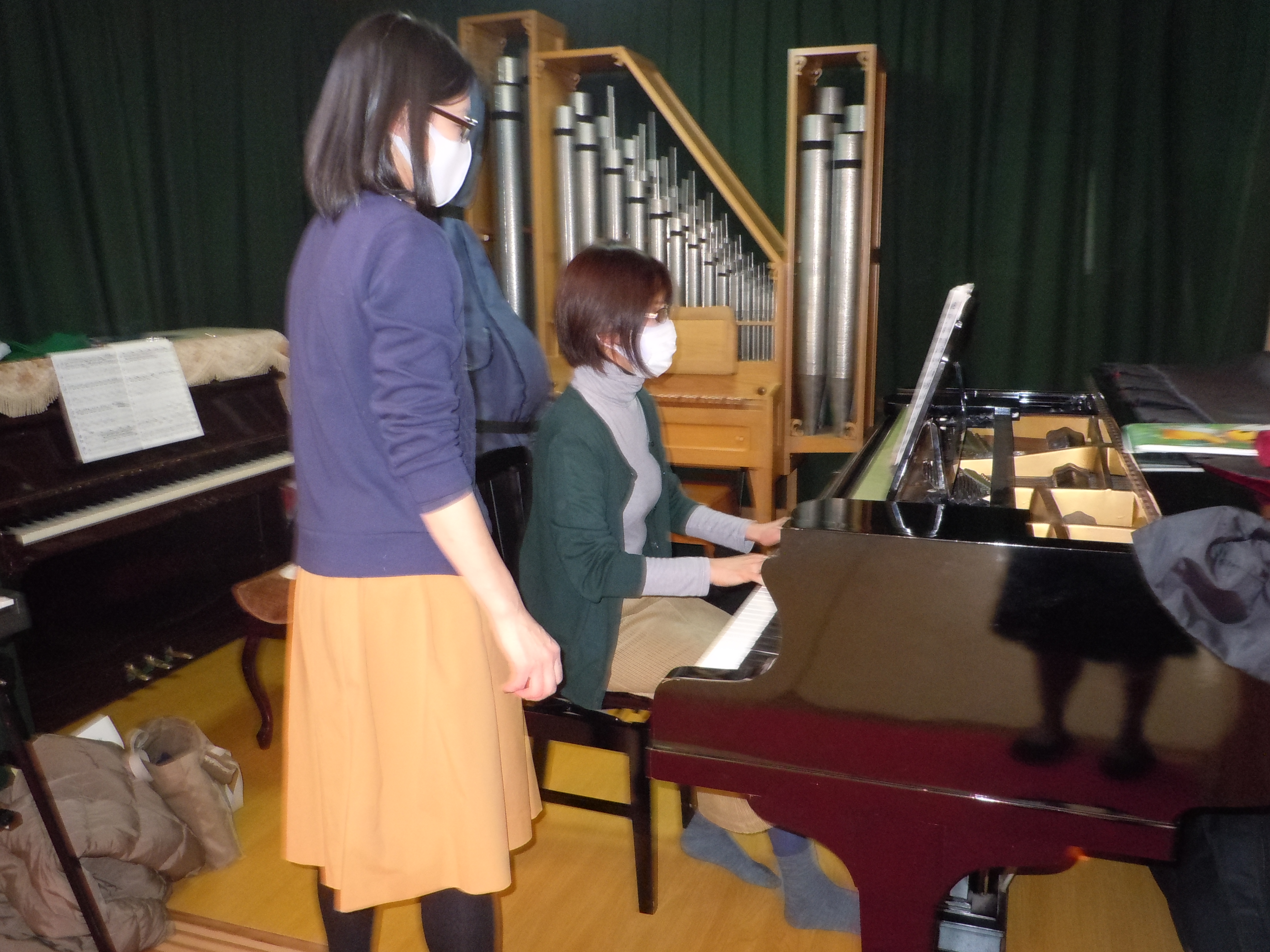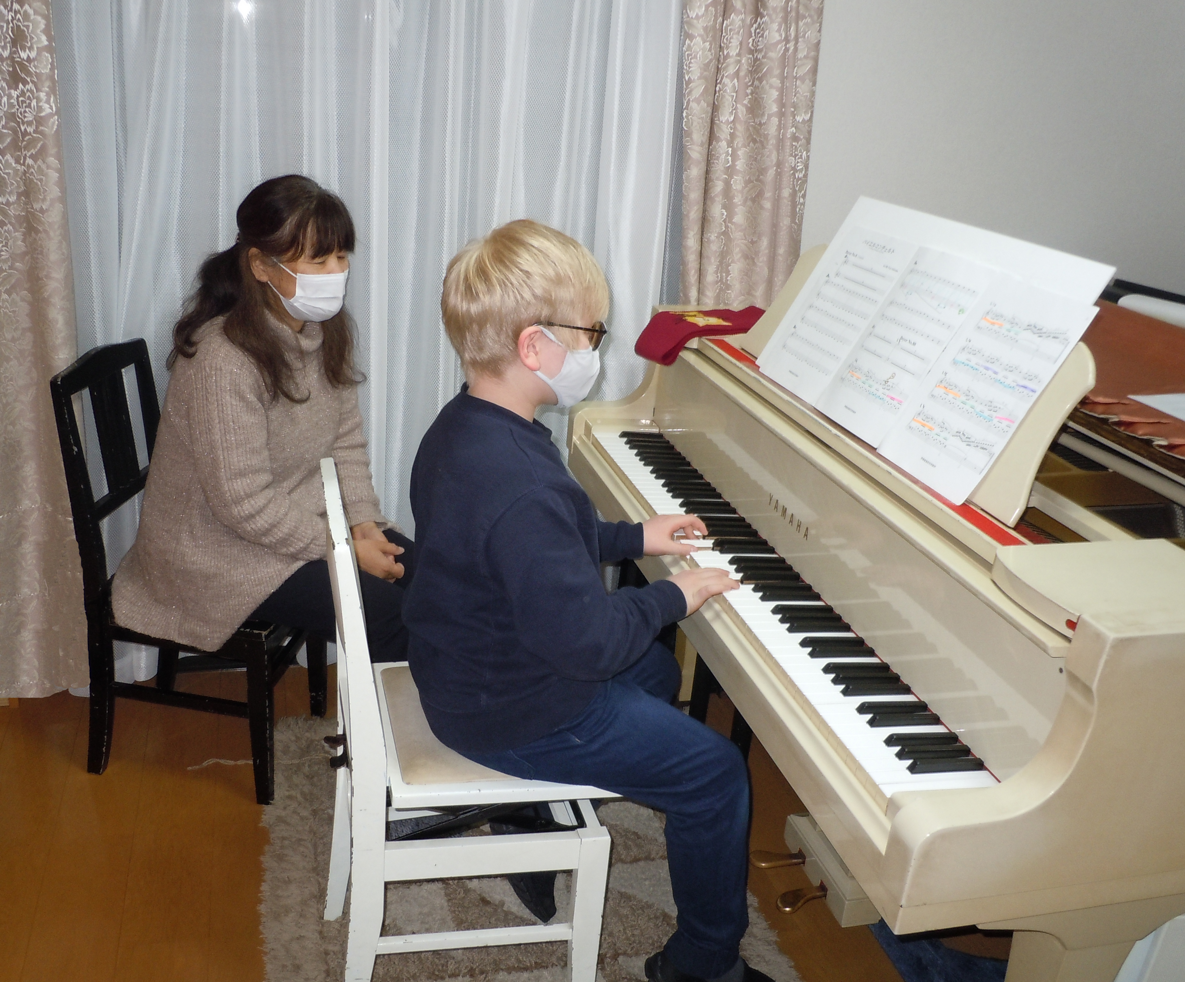 ピアノのレッスン。白いグランドピアノでレッスンしています。
